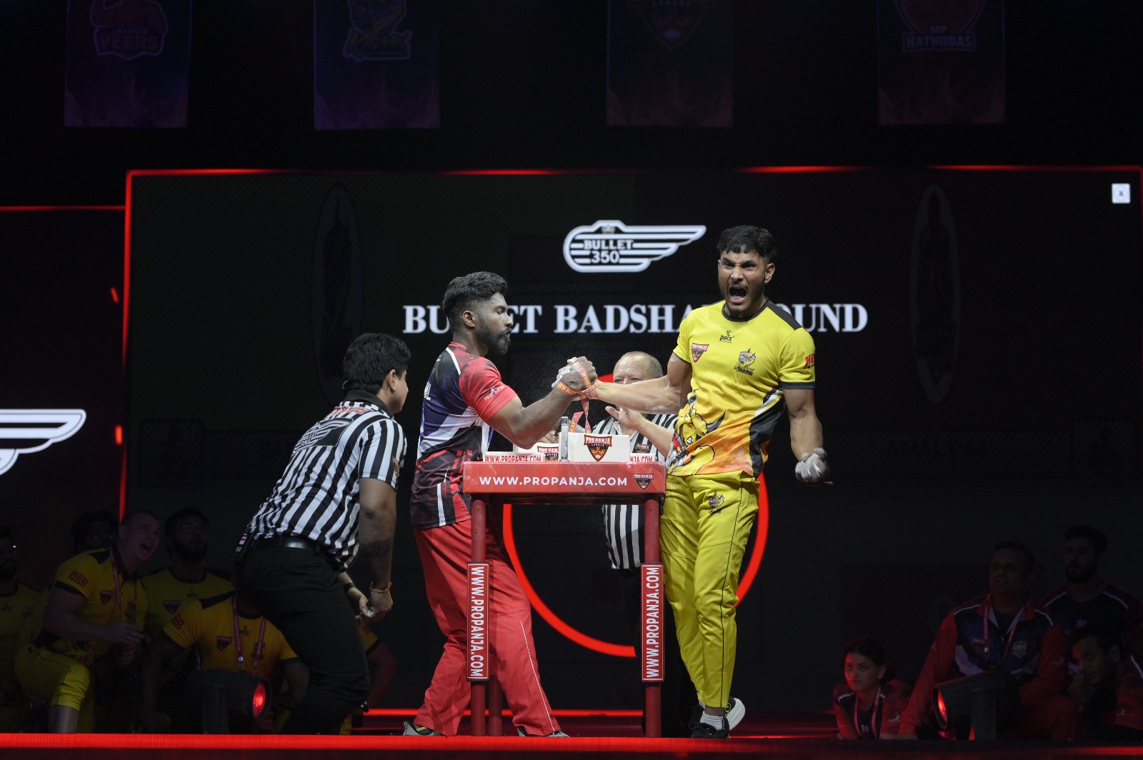 In Undercard Fixture 1, Pro Panja stage witnessed Mumbai Muscle vs Jaipur Veers high octane clash for women participation. In 65+ kg category participation Shruti Bawa of Mumbai Muscle tried to give a tough time to Yogesh Chaudhary of Jaipur Veers, which in reverse proved very taxing for the Mumbai Muscle Athlete along with facing a very vulnerable time. Before a third round could begin, Yogesh Chaudhary was awarded the 2-0 score to announce Jaipur Veers early win in the second bout, as Shruti Bawa had withdrawn herself to the powerful pin of Yogesh’s strong will. Following the previous clash, a 65 kg participation took place in form of Bandarika Khaongar of Mumbai Muscle vs Bimla Rawat of Jaipur Veers. Bimla Rawat of Jaipur Veers struck two pins as a revenge communication while clashing against her opponent Bandarika of Mumbai Muscle after the athlete’s win in the first round. Securing a 2-1 score for her team Mumbai Muscle, Bimla Rawat added pride for Mumbai Muscle to award her power the loudest applause in the undercard battle. The third round of fixture 1, in the 55 kg participation Ardhra Suresh of Mumbai Muscle proved fatal for Shweta Rajawat of Jaipur Veers. The Mumbai Muscle athlete gave a resounding two pin response to opponent Shweta Rajput after her score in the first bout. Ardha Suresh of Mumbai Muscle took the win with a fast 2-1 score securing victory against Shweta Rajput of Jaipur Veers.